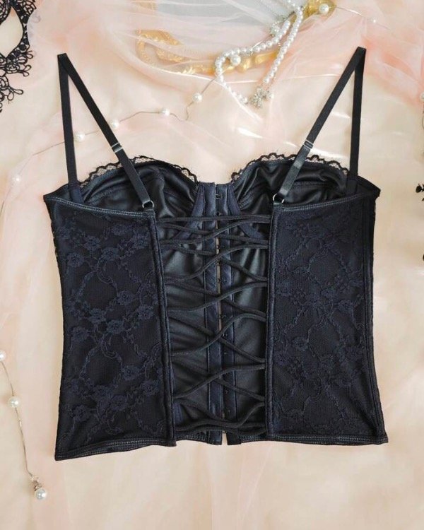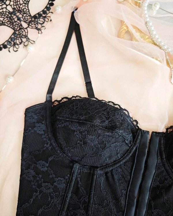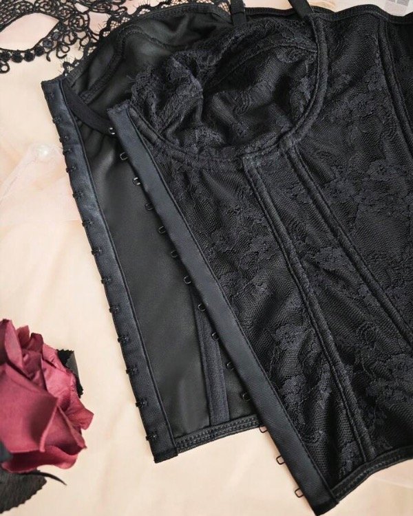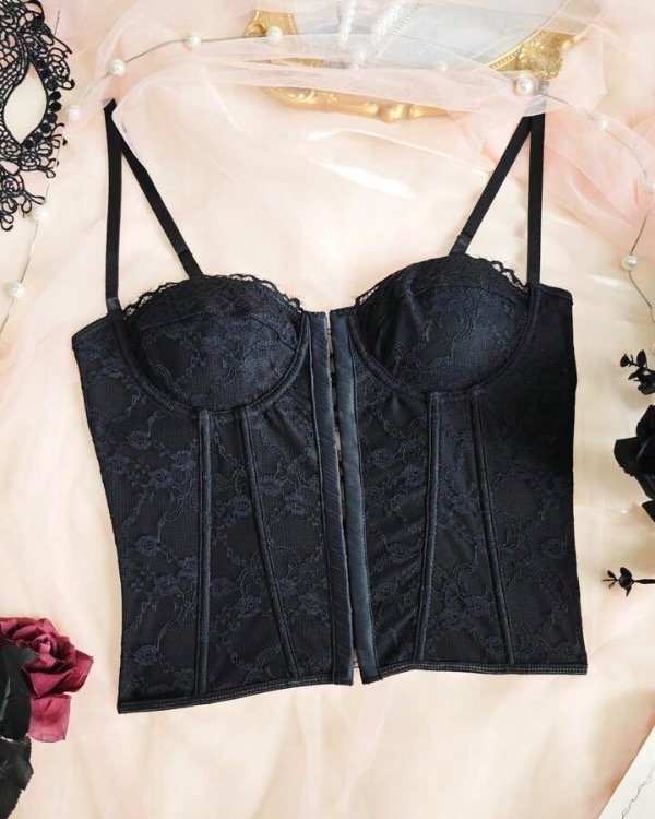 Corset de encaje con tiras regulables, espalda abierta y broches al frente. Taza chica.