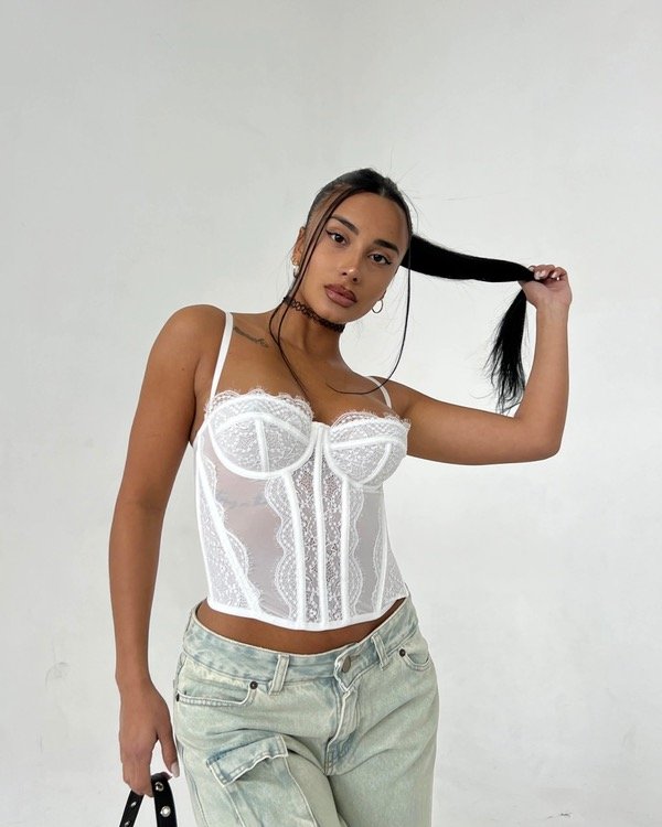 Corset de encaje con tiras regulables y 3 posiciones en la espalda. Taza chica.